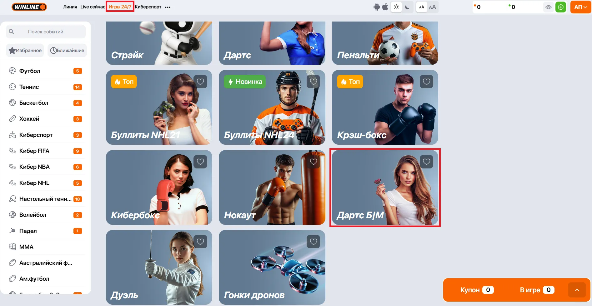 Не нужно копаться в интерфейсе или бегать по вкладкам — «Больше/Меньше» прячется в разделе “Игры 24/7” на сайте и в приложении Винлайн. Переходишь — и сразу влетаешь в дартс-сессию с двух кнопок.