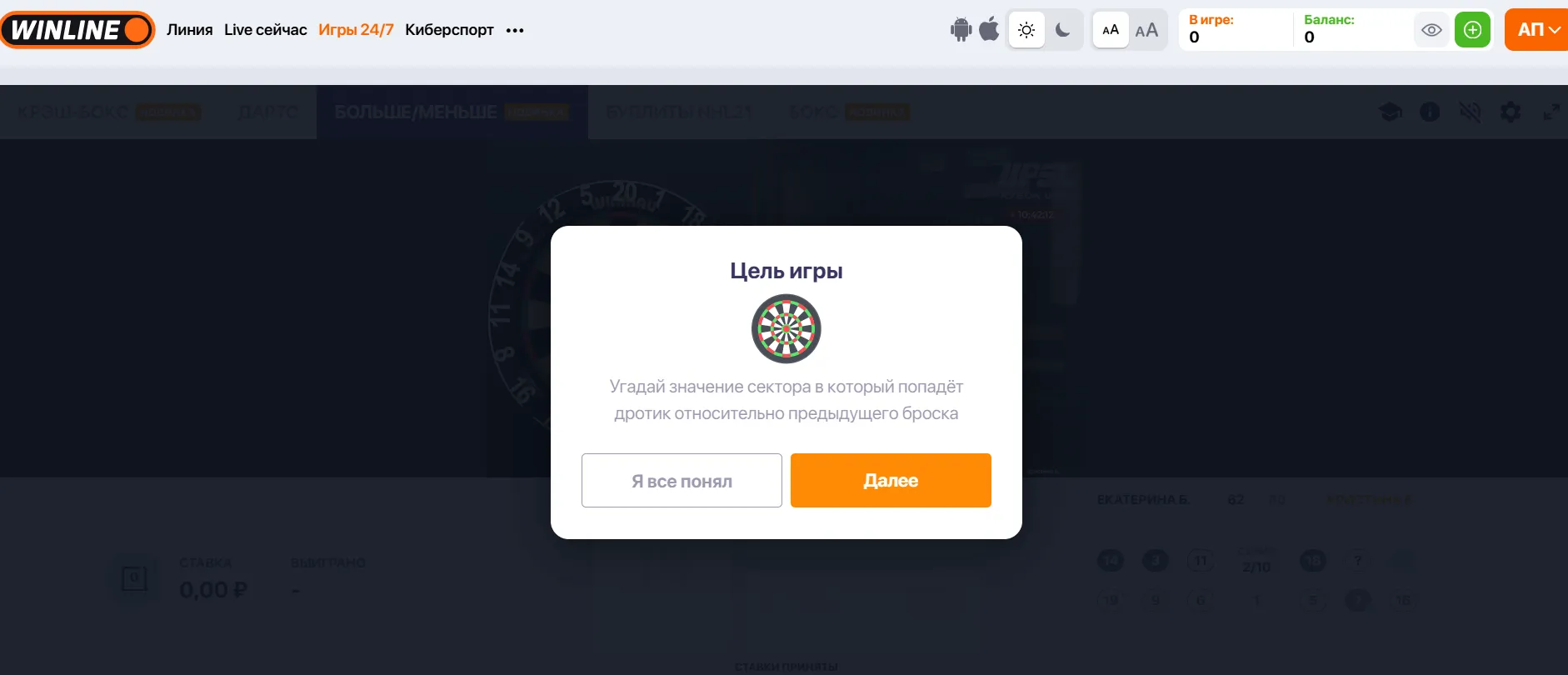 - Заходишь в «Игры 24/7» и выбираешь «Больше/Меньше». Это быстрые игры от Winline — прямо на главной странице или в разделе «Live». Никаких загрузок, скачиваний, доп. приложений. Просто клик — и ты уже на экране с дартсом.