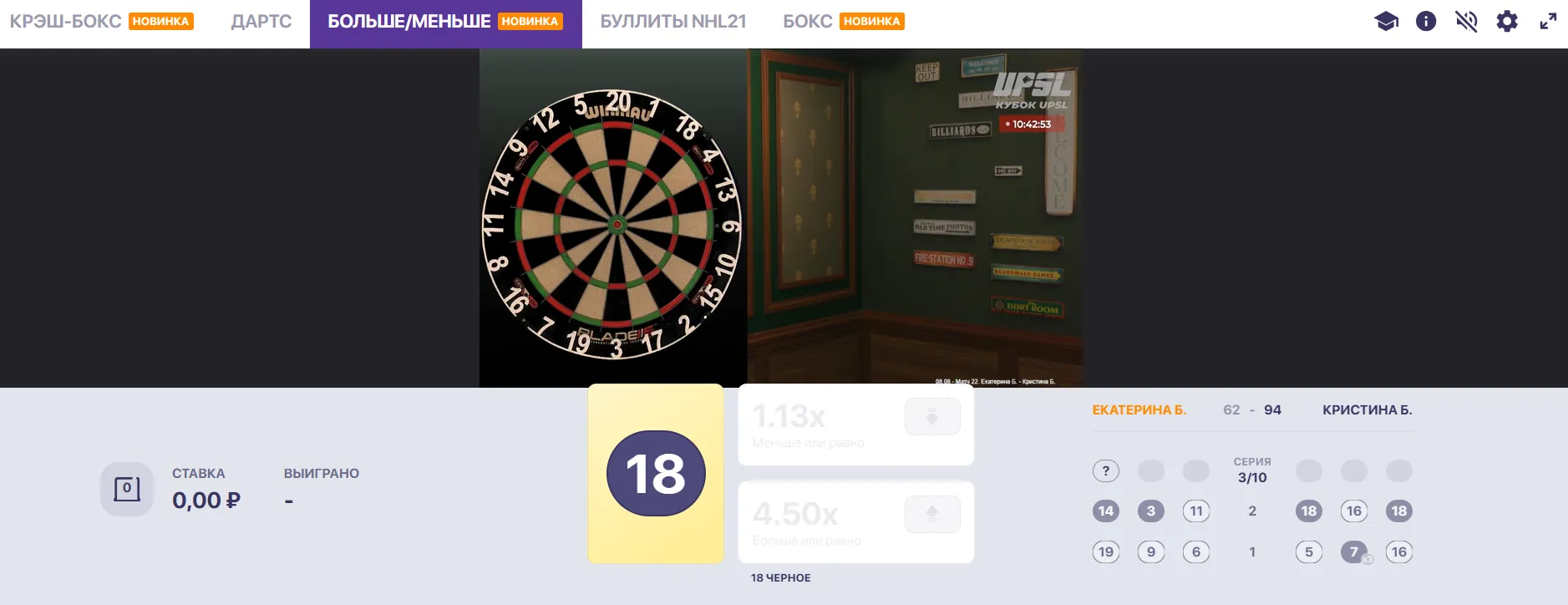 «Больше/Меньше» — это не совсем дартс в привычном виде. Здесь неважно, в какую часть мишени попадёт дротик. Главное — цифровое значение сектора. Тебе показывают результат предыдущего броска и предлагают угадать, будет ли следующий больше, меньше или равен.