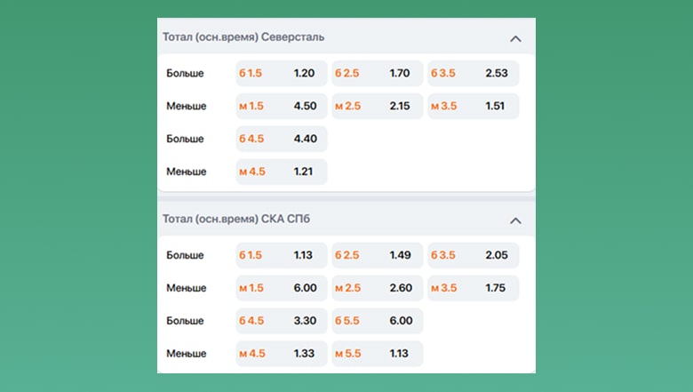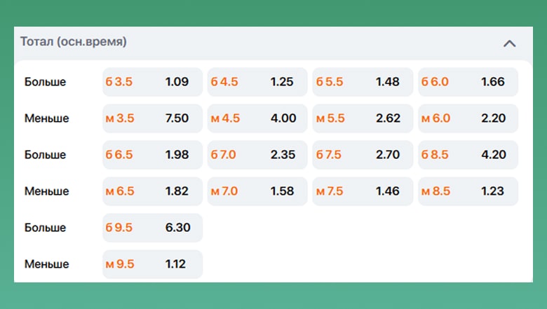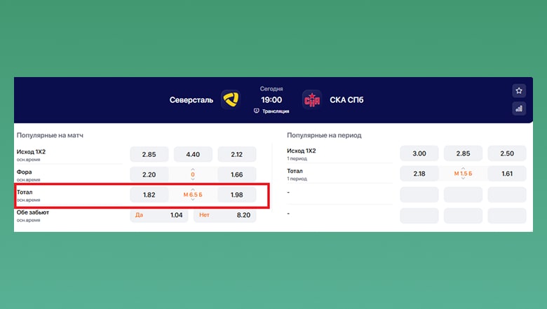 Общий тотал — это когда ты ставишь на количество голов, которые забьют обе команды в матче. Тут всё просто: не важно, кто из них победит, важно, сколько шайб они суммарно вколотят в ворота. Например, если тотал 5,5, значит, тебе нужно, чтобы в матче было 6 или больше голов. Если забьют 5 или меньше — ты проиграл, как и при тотале «меньше».