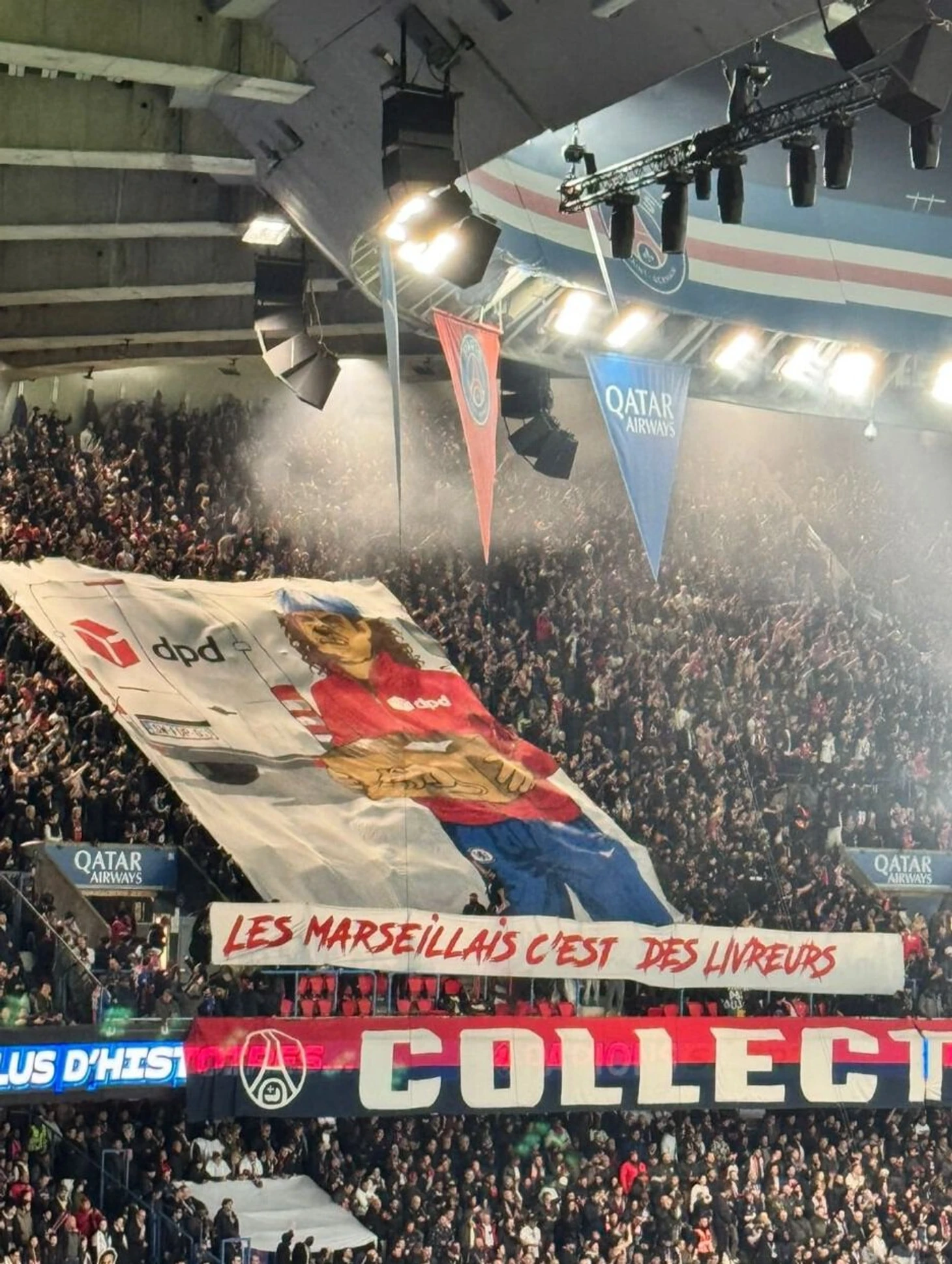Текст на баннере содержал фразу «Болельщики «Марселя» — курьеры», что, по мнению экспертов, является завуалированным гомофобным оскорблением. Название компании DPD во французском произношении созвучно с выражением «des pédés» («педики»), которое часто используется парижскими ультрас в уничижительном контексте по отношению к поклонникам «Марселя».