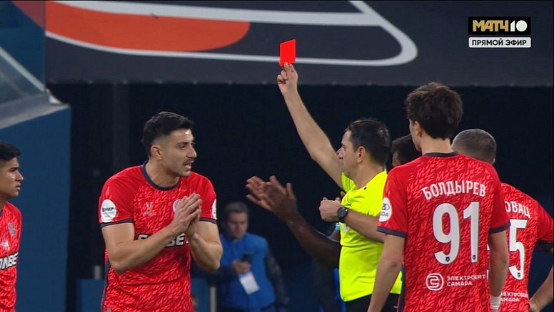 На 14-й минуте матча чемпионата России между «Зенитом» и «Акроном» главный арбитр Павел Кукуян показал прямую красную карточку футболисту тольяттинцев Йонуцу Неделчяру, который отмахнулся в борьбе с Педро. Журналист Иван Карпов в личном Telegram-канале так отреагировал на происходящее на «Газпром Арене»: