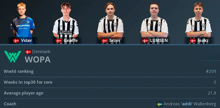 WOPA сейчас занимает 181 место в мировом рейтинге, и хотя команда стала реже появляться на крупных турнирах HLTV, в датской сцене она продолжает удерживать довольно высокий статус. На старте текущего сезона парни провели два непростых матча на пиках соперников: они уверенно справились с Prestige, но проиграли Preasy Volt, одной из сильнейших команд чемпионата.