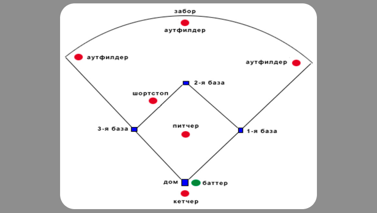 Базы: Бейсбольное поле имеет четыре базы - первую, вторую, третью и хом-плейт. Бейсмены стартуют с первой базы и стараются достичь последующих баз, чтобы забить очки.
