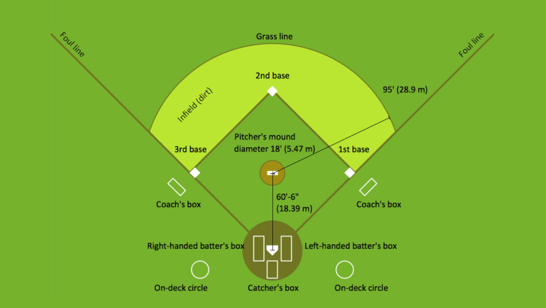 Размеры поля: Бейсбольное поле имеет прямоугольную форму и состоит из трех основных частей: внешней поляны, внутреннего поля и защитной зоны для питчера. Размеры поля могут варьироваться в зависимости от уровня игры, но в профессиональном бейсболе обычно используются следующие размеры: расстояние между базами - около 27,4 метра, расстояние от питчера до хом-плейта - около 18,4 метра.